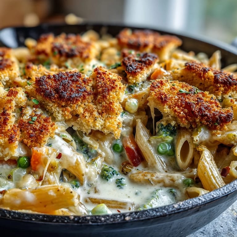 Save Experience the ultimate comfort of two classic dishes combined in this Creamy Veggie Pot Pie Pasta. This recipe captures the savory, heart-warming essence of a traditional vegetable pot pie and delivers it in an easy-to-make, one-pot pasta format. Finished with a crisp, buttery biscuit crumb topping, it is a satisfying meal that the whole family will enjoy.