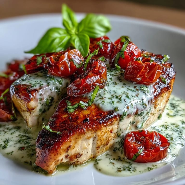 Save There's something about the smell of basil hitting hot oil that stops me mid-afternoon. I discovered this dish on a Tuesday when I had exactly four chicken breasts and a jar of pesto staring at me from the pantry, plus a craving for something that felt fancy but didn't require a recipe hunt. Twenty-five minutes later, I had tender chicken swimming in the creamiest green sauce, with blistered tomatoes on top that tasted like summer had just decided to caramelize.
