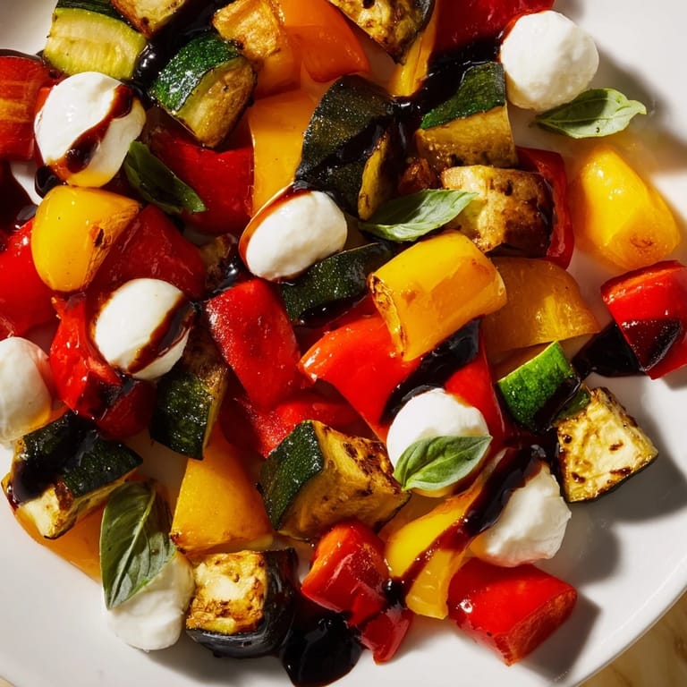 Save The oven timer went off just as my neighbor knocked on the door, and I opened it to the smell of caramelized vegetables flooding the hallway. She peered past me into the kitchen, curious, and I invited her in to see what I was working on. That afternoon, we sat on my back porch with bowls of this roasted veggie caprese salad, and she asked for the recipe before she even finished eating. It's been my go-to ever since when I want something that feels special but comes together without fuss.