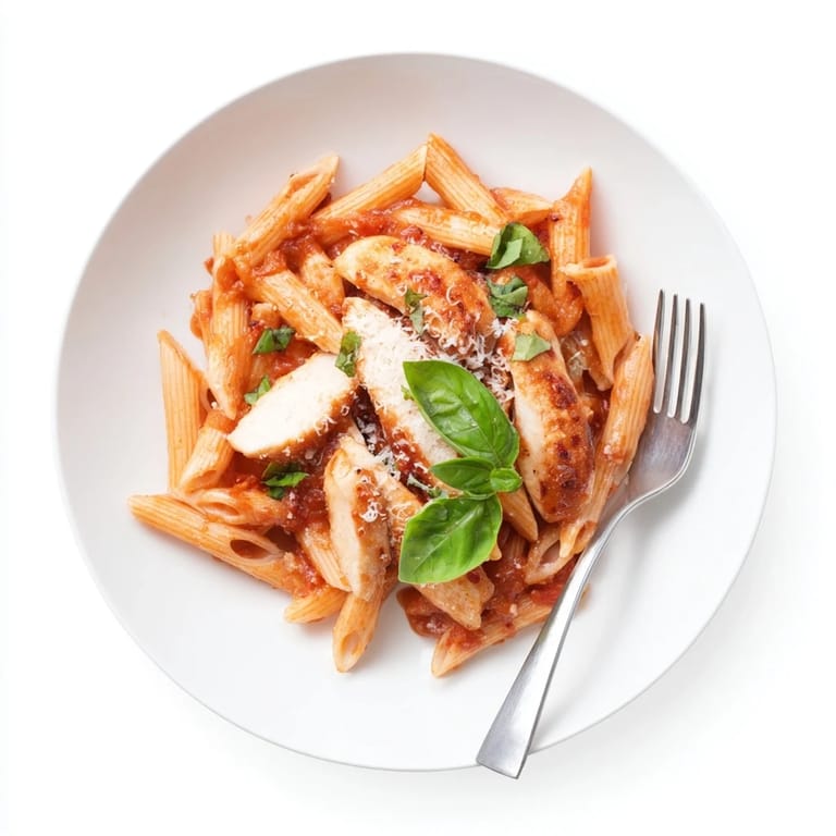 - Add the drained penne directly into the sauce and toss until every piece is coated. Top with the sliced chicken, scatter fresh basil over everything, and finish with Parmesan if youre using it.